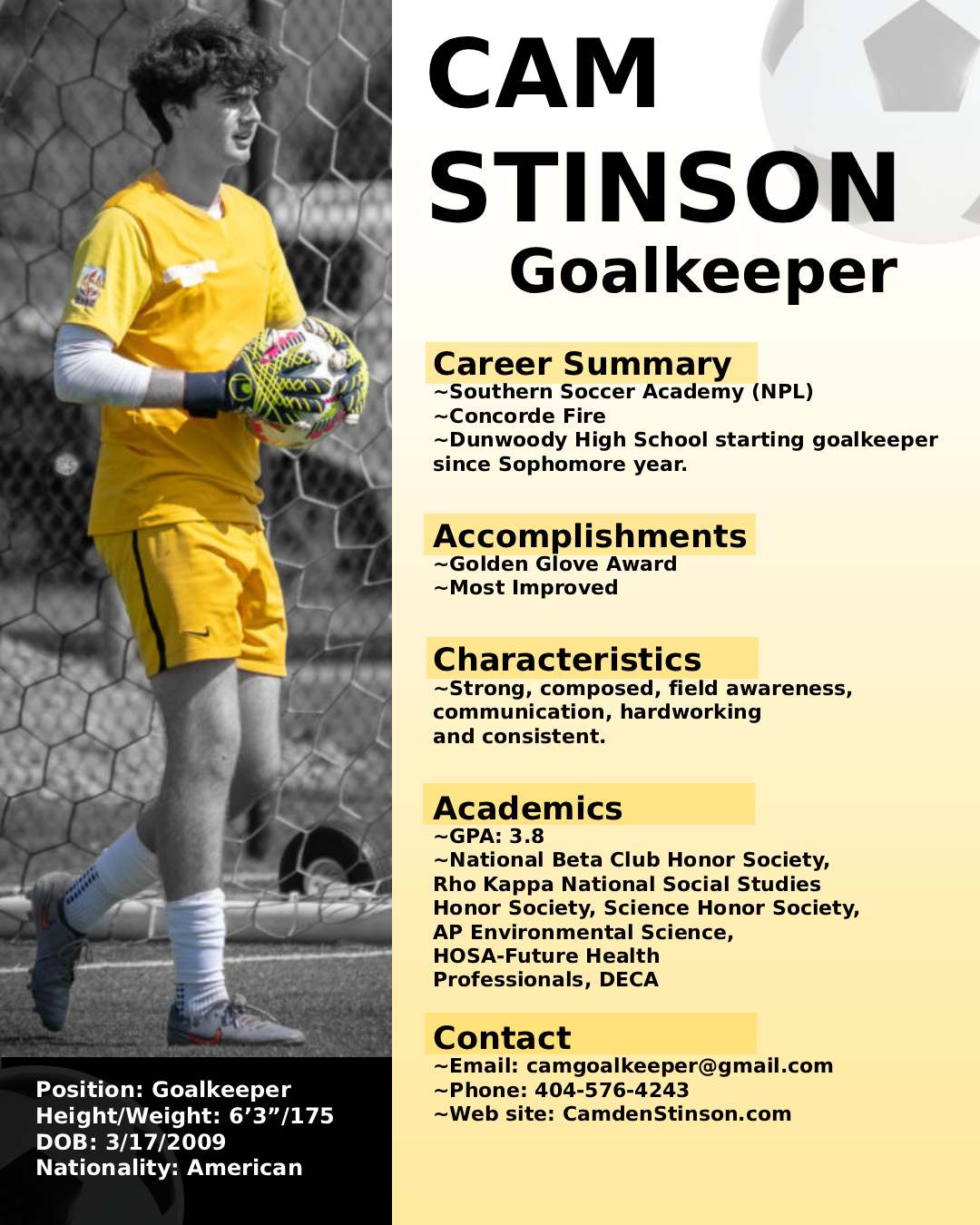 Teams: Southern Soccer Academy Swarm FC (NPL), (Champions – Chattanooga Red Wolves Invitational Fall ’25 ), Concorde Fire, Dunwoody High School Varsity starting goalkeeper since Sophomore year (Golden Glove Award & Most Improved)